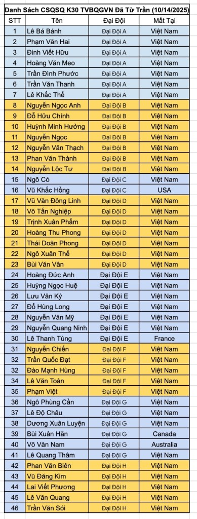 Bản danh sách này có sự góp ý của nhiều anh em trong và ngoài nước, tuy vậy vẩn có thể chưa đầy đủ và cần bổ túc (10/14/2025).