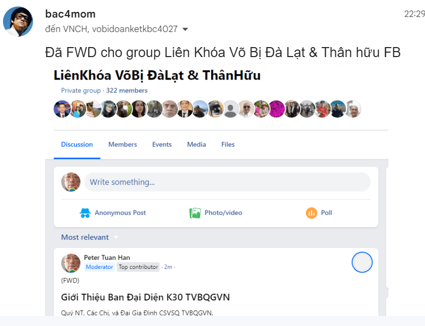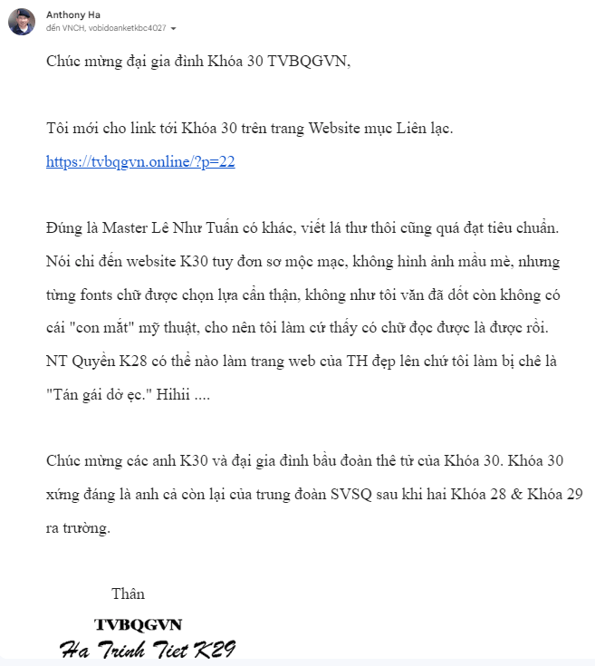 Điện thư của NT Hà Trinh Tiết K 29.