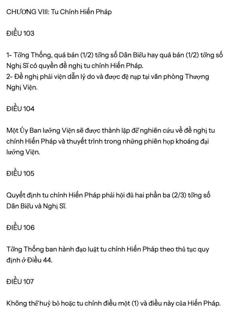 Nhờ có bản Hiến Pháp VNCH nằm trong Website K30, nên mới đọc đi đọc lại. Thì ra, chương VIII là về “Tu Chính Hiến Pháp”, và điều 105: “Quyết Định Tu Chính Hiến Pháp phải hội đủ hai phần ba (2/3) tổng số Dân Biểu và Nghị Sĩ.” Nhiệm kỳ 1971-1975, quốc hội VNCH có 159 Dân Biểu và 60 Nghị Sĩ, nên hai phần ba (2/3) là 146. Quốc hội họp lần cuối ngày 04/27/1975 chỉ có 139 vị, vậy không hội đủ tỷ số quy định (quorum) để thay đổi Hiến Pháp và trao chức Tổng Thống cho Dương Văn Minh.